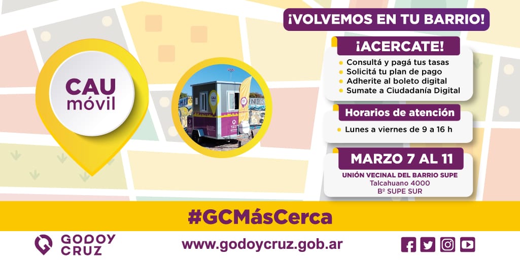 El CAU Móvil sigue su recorrido por los barrios de Godoy Cruz. Allí se puede consultar y pagar las tasas municipales, solicitar un plan de pago, adherirse al boleto digital o a Ciudadanía Digital.
