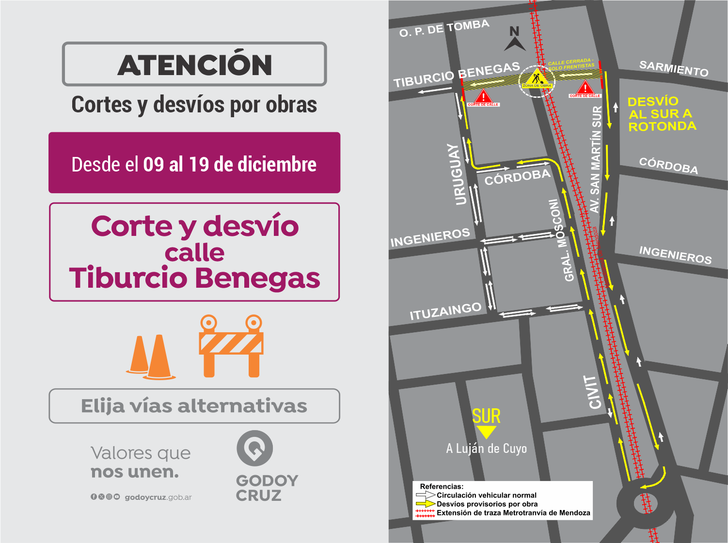 Así, quienes circulen desde el Este, deberán desviarse por San Martín Sur hacia el Sur hasta la rotonda San Francisco de Asís. Desde allí, deberán retomar por Civit y Mosconi hasta Córdoba. Luego hacia el Norte por Uruguay hasta retomar Tiburcio Benegas.