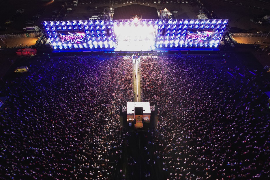 La escena se volvió aún más especial con la presencia de los robots luminosos, que recorrieron el predio con juegos de luces y movimientos sincronizados. Así, bailaron entre la gente y también subieron al escenario, aportando un toque futurista y dinámico a una noche ya encendida.