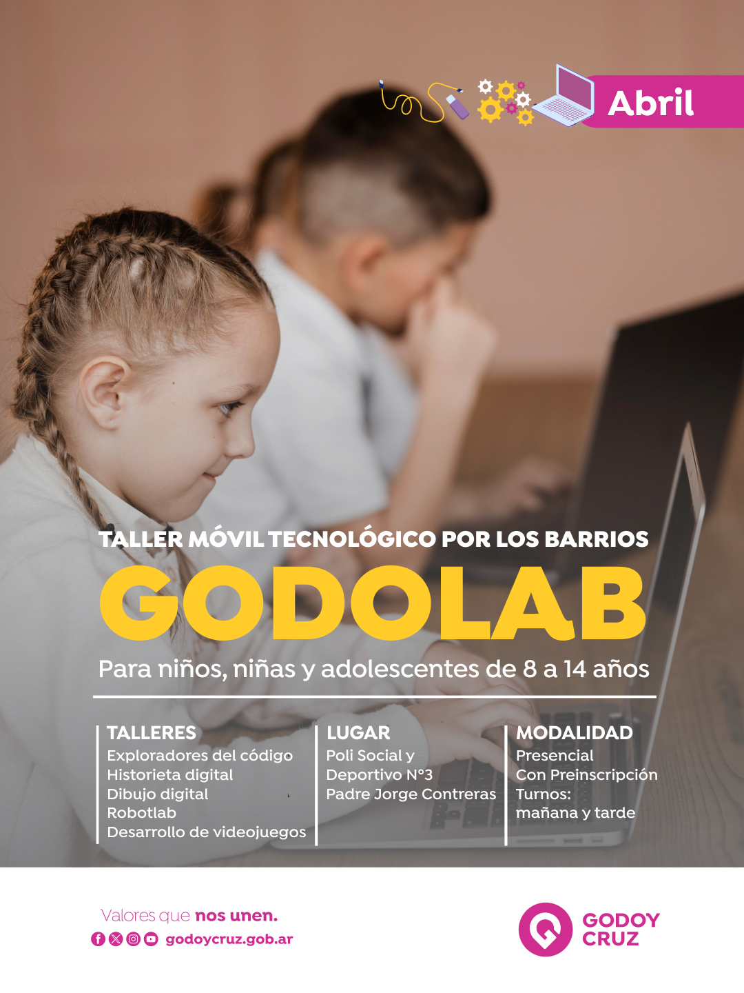 El recorrido comenzará el 8 de abril en el Poli Social y Deportivo Padre Contreras, ubicado en Rawson y Vélez Sarsfield s/n, Barrio La Gloria. Allí, el taller móvil GodoLab permanecerá entre 30 y 45 días, para luego trasladarse a otros puntos del departamento.