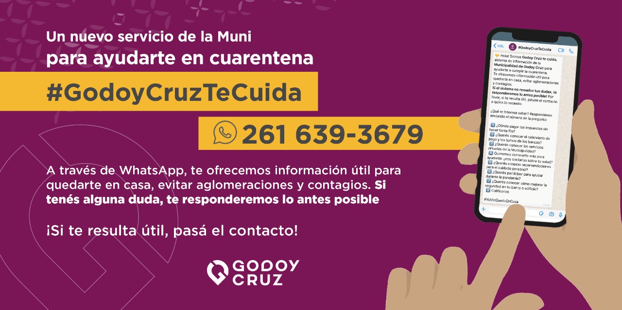 • La respuesta será: «Somos Godoy Cruz te cuida, sistema de información de la Municipalidad de Godoy Cruz para ayudarte a cumplir la cuarentena. Te ofrecemos información útil para quedarte en casa, evitar aglomeraciones y contagios».