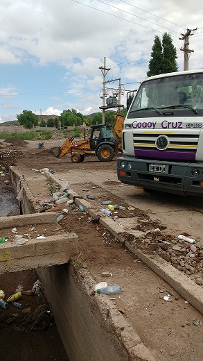 Con 16 camiones y 4 retroexcavadoras se limpiaron cauces y aludes que se produjeron durante la lluvia en la zona oeste del departamento. Además, se levantaron 20 toneladas de residuos y envases pet que quedaron diseminados en acequias y cauces.