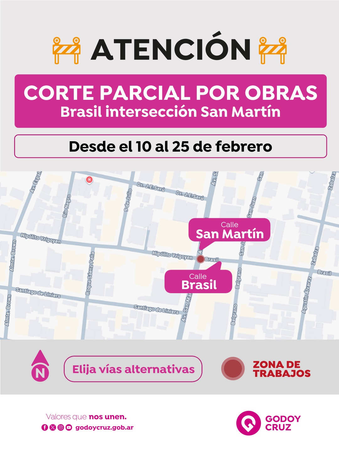 Por reparación de la alcantarilla, la calle Brasil, en su intersección con San Martín, tendrá un corte de media calzada. Será desde el martes 10 hasta el 25 de febrero, por lo que se solicita circular con precaución