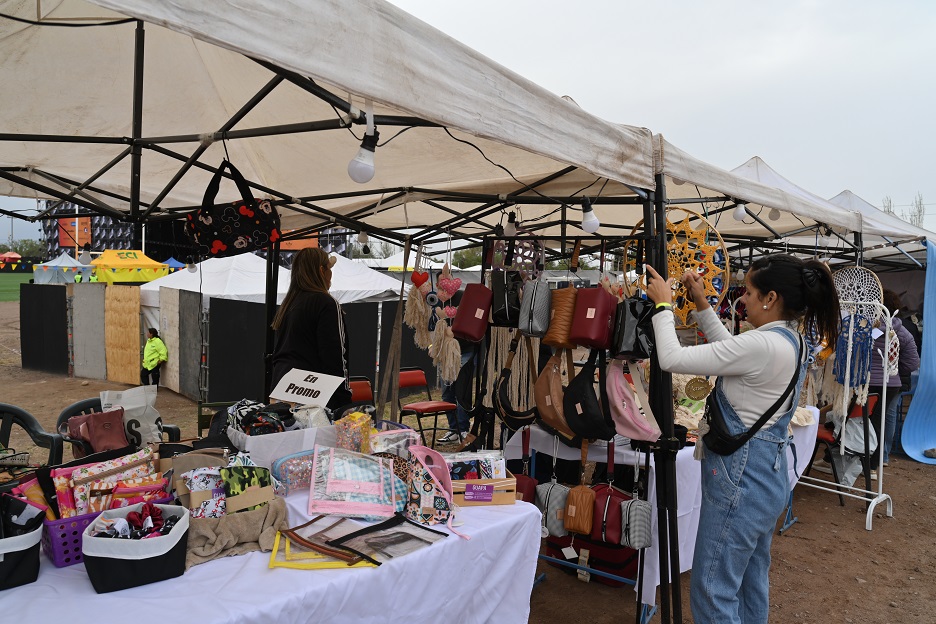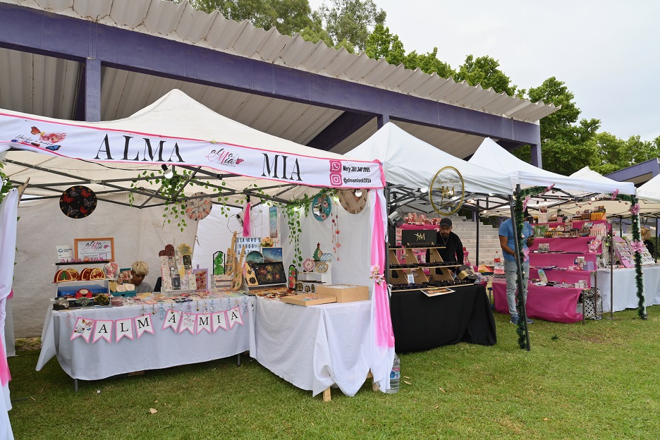 Más de 30 estudiantes de los talleres de economía social del Municipio participan del evento con stands a la derecha del escenario.