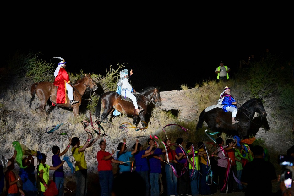 El momento cúlmine de la noche fue la aparición de Melchor, Gaspar y Baltasar desde los cerros. La escena despertó la emoción de los niños, y también de personas adultas, en un clima de alegría compartida.