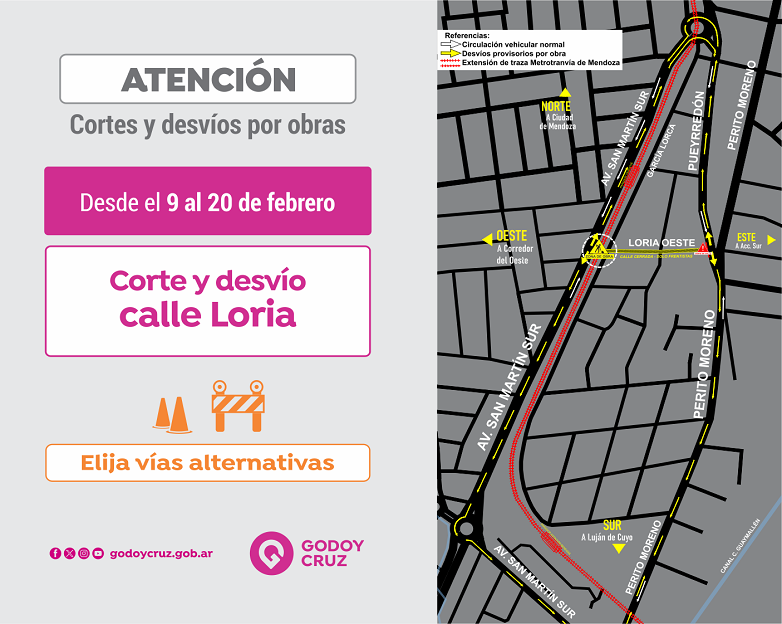 Desde el lunes 9 de febrero, la calle Loria Oeste, entre San Martín Sur y Pueyrredón, estará cortada al tránsito vehicular.