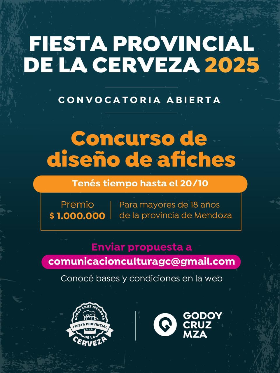 Desde hoy y hasta el 20 de octubre, las personas interesadas en participar podrán mandar sus diseños a comunicacionculturagc@gmail.com. Es importante destacar que las piezas deberán enviarse en PNG y en archivo editable, y podrá participar cualquier persona mayor de 18 años de Mendoza. El diseño ganador será elegido por un jurado especializado y el premio será de $ 1.000.000.