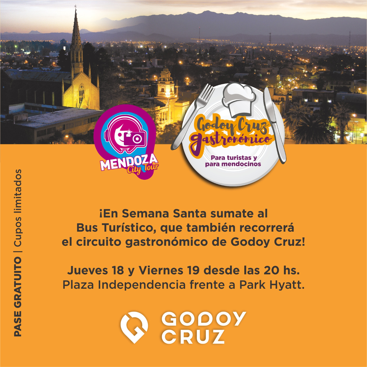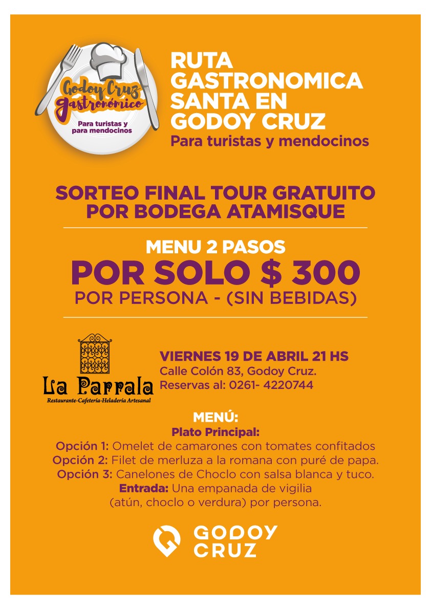El programa “Godoy Cruz Gastronómico” desarrollado por la Subdirección de Turismo sigue a paso firme. La “Ruta” tendrá este jueves 18 y viernes 19 su versión de semana santa, para aquellos mendocinos que deseen disfrutar de la buena gastronómia, a través de un menú de 2 pasos a $300 por persona (sin bebidas). Habrá sorteos para los comensales por un tour de vinos a la Bodega Atamisque.