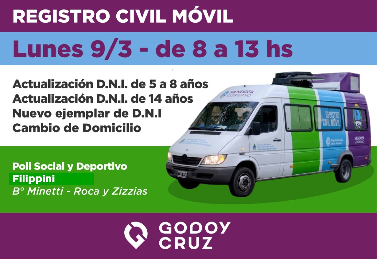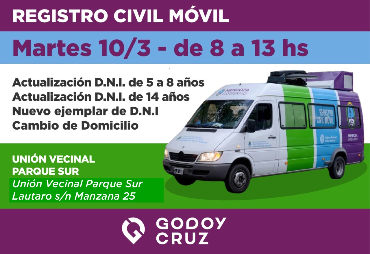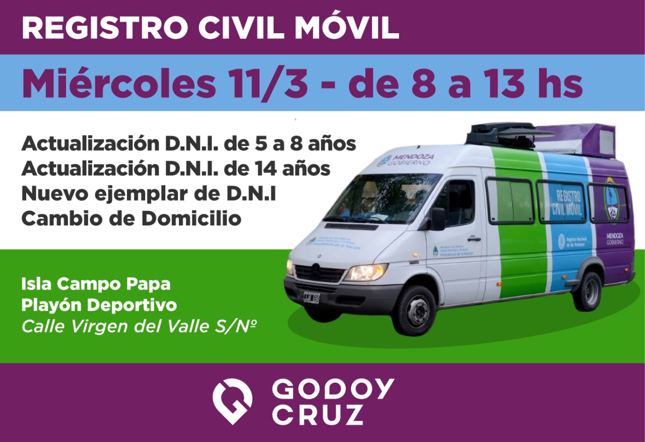 El Registro Civil Móvil estará en Godoy Cruz este lunes, martes y miércoles. Los vecinos podrán tramitar el documento de identidad, actualizarlo o realiza el cambio de domicilio.
