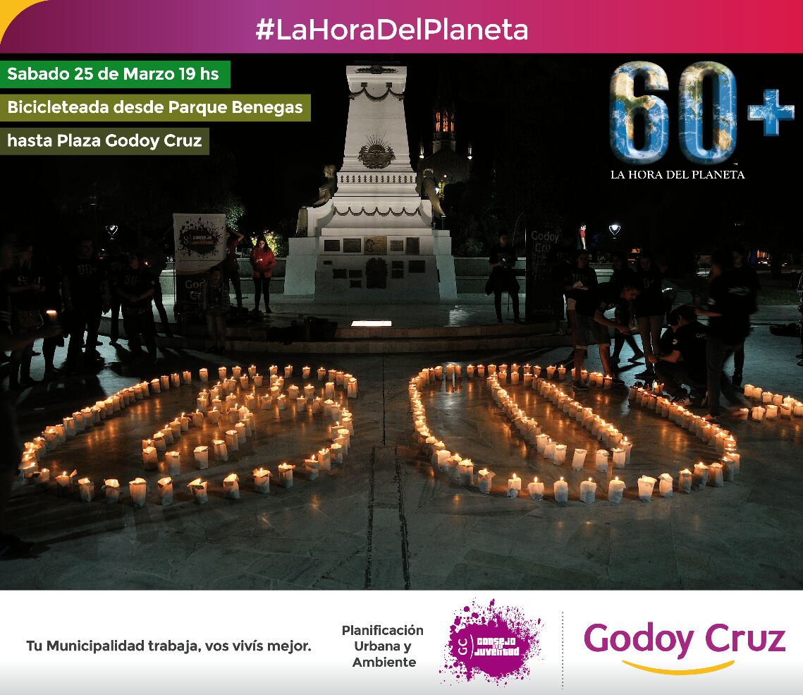 La Municipalidad de Godoy Cruz, invita a sumarse el próximo sábado 25, a la “Hora del Planeta”, a realizarse en el corazón de la Plaza Departamental de 20.30 a 21.30hs. La Hora del Planeta es un gesto simbólico, y a su vez el mayor movimiento ambiental que consiste en apagar las luces durante una hora, para demostrar así que cada uno de nosotros podemos tener un impacto positivo en la lucha frente al cambio climático.