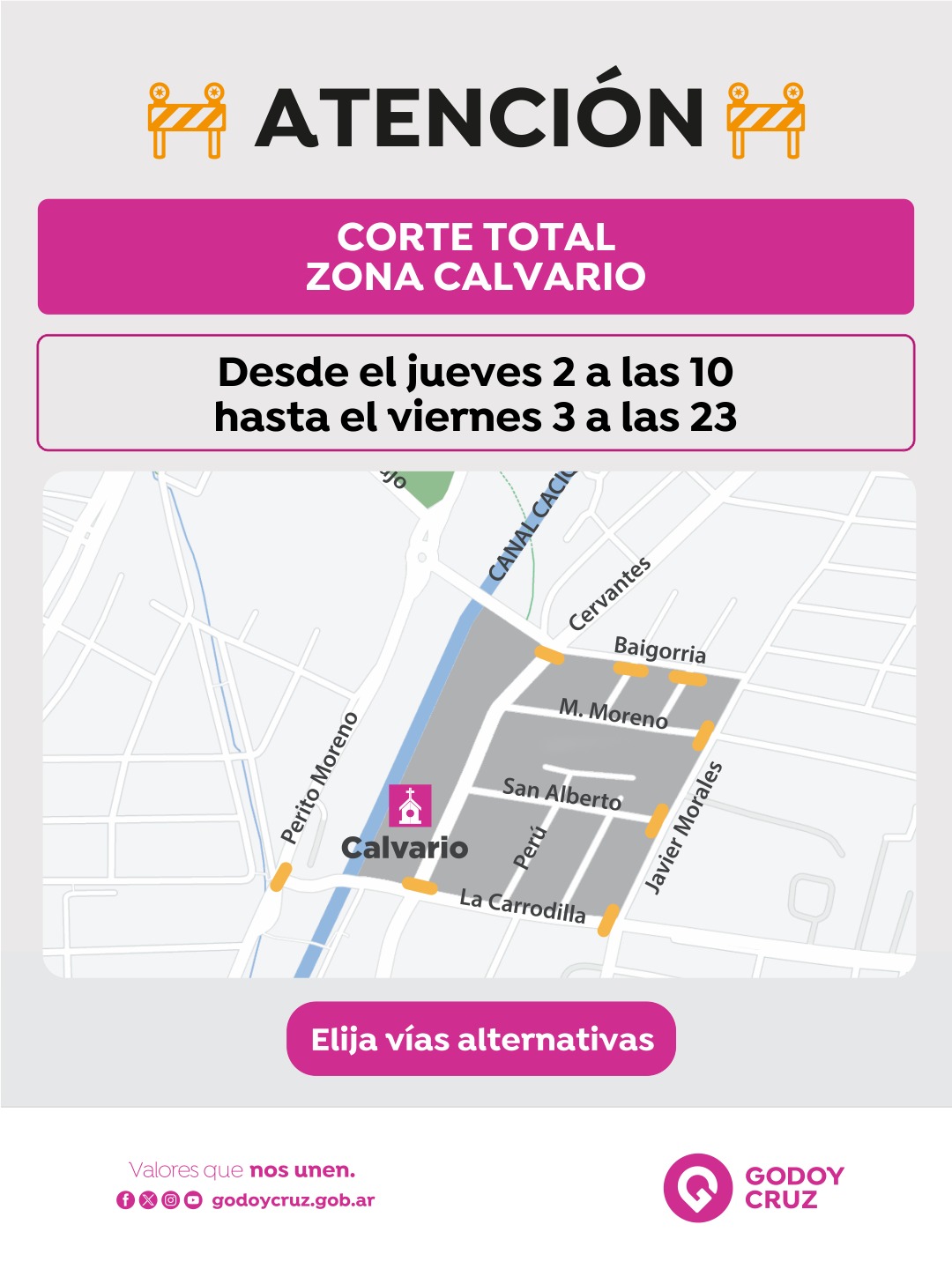 Entonces, la interrupción vehicular será en calle La Pampa, entre Perito Moreno y Cervantes. Y en Cervantes, desde Baigorria hasta La Carrodilla. También La Carrodilla se cortará desde Perito Moreno hacia el Este.