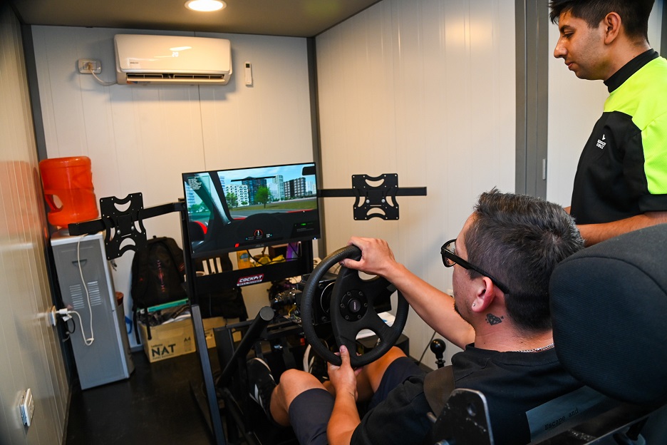 Además, el simulador de manejo recrea el interior de un vehículo con butaca, pedalera y caja de cambios. Entonces, quienes participan pueden practicar maniobras básicas y observar cómo funcionan los distintos dispositivos.